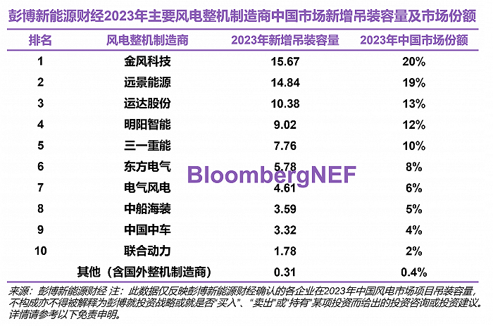 2月19日,彭博新能源財經(jīng)發(fā)布2023年中國風(fēng)電整機(jī)制造商新增吊裝容量排名。