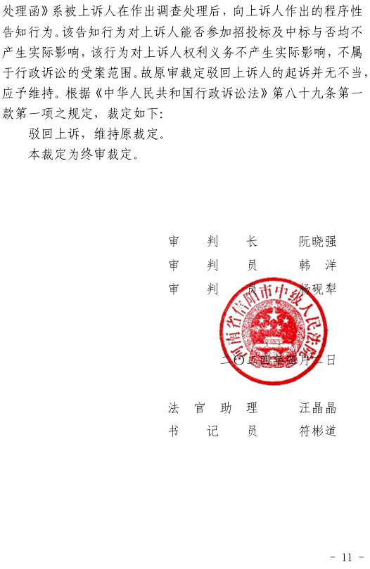 二審法院裁定的理由是:二審經(jīng)審理查明的事實與原審查明事實一致,不屬于行政訴訟的受案范圍【詳見下附一:《河南省信陽市中級人民法院行政裁定書》(共11頁)】。