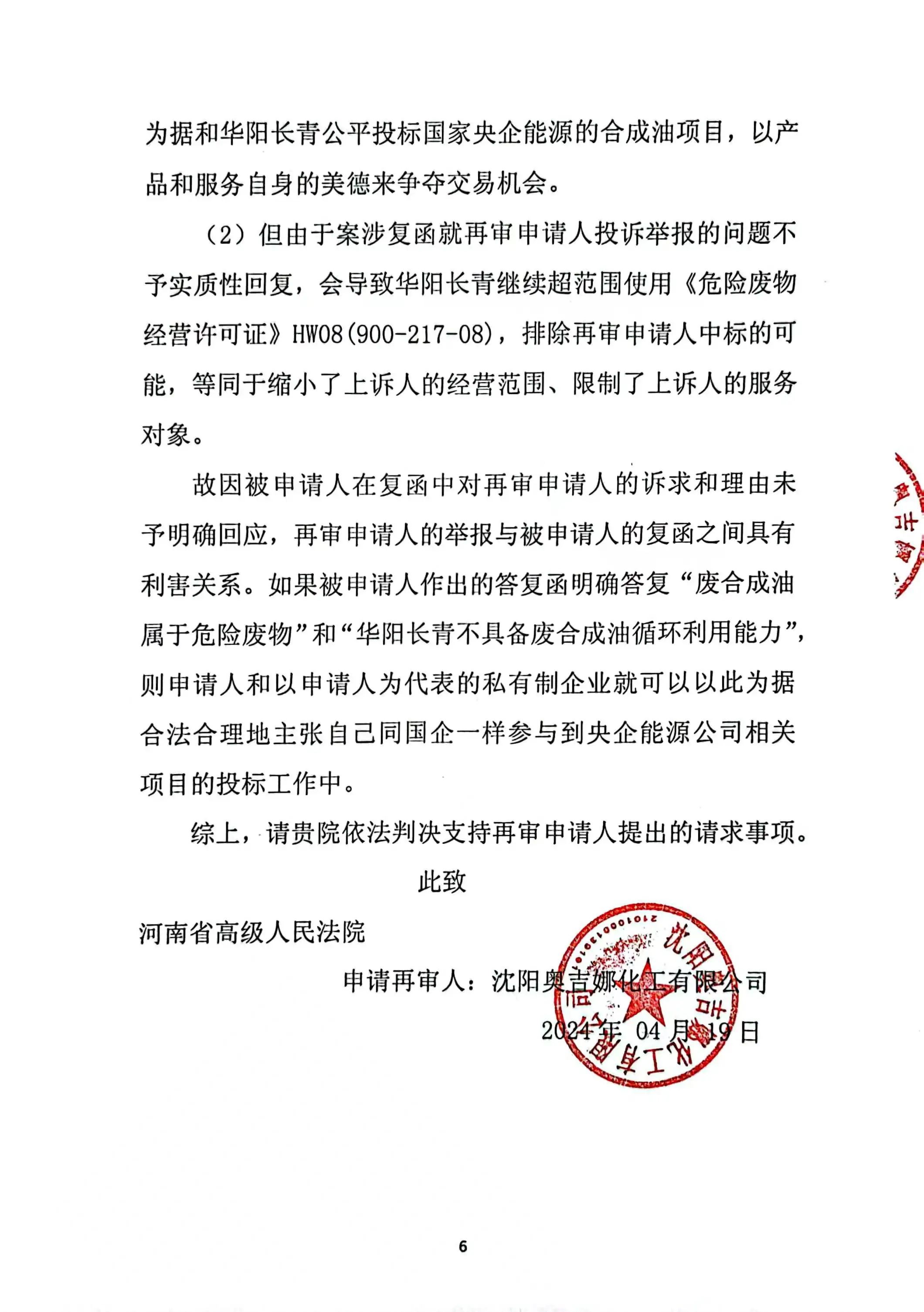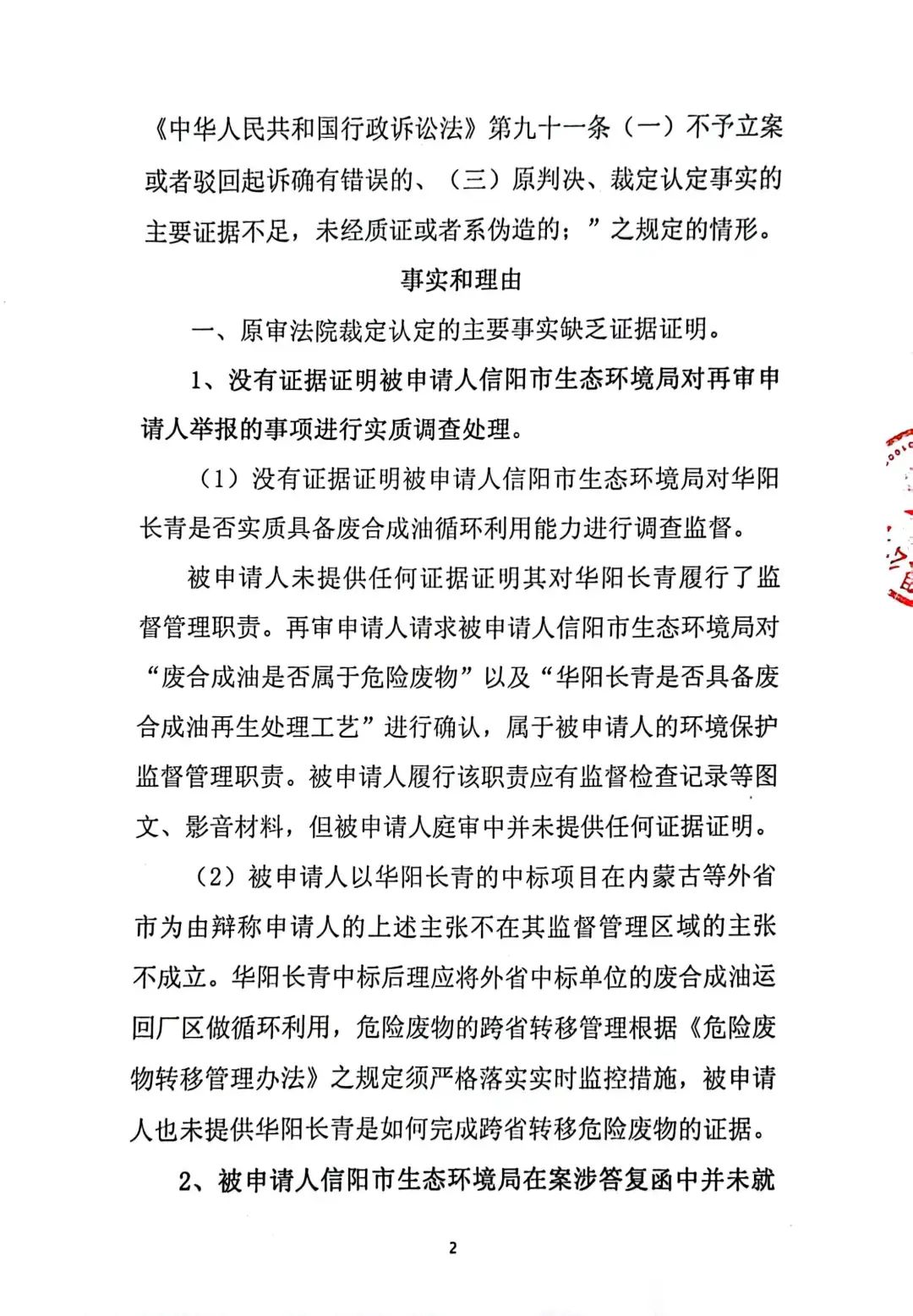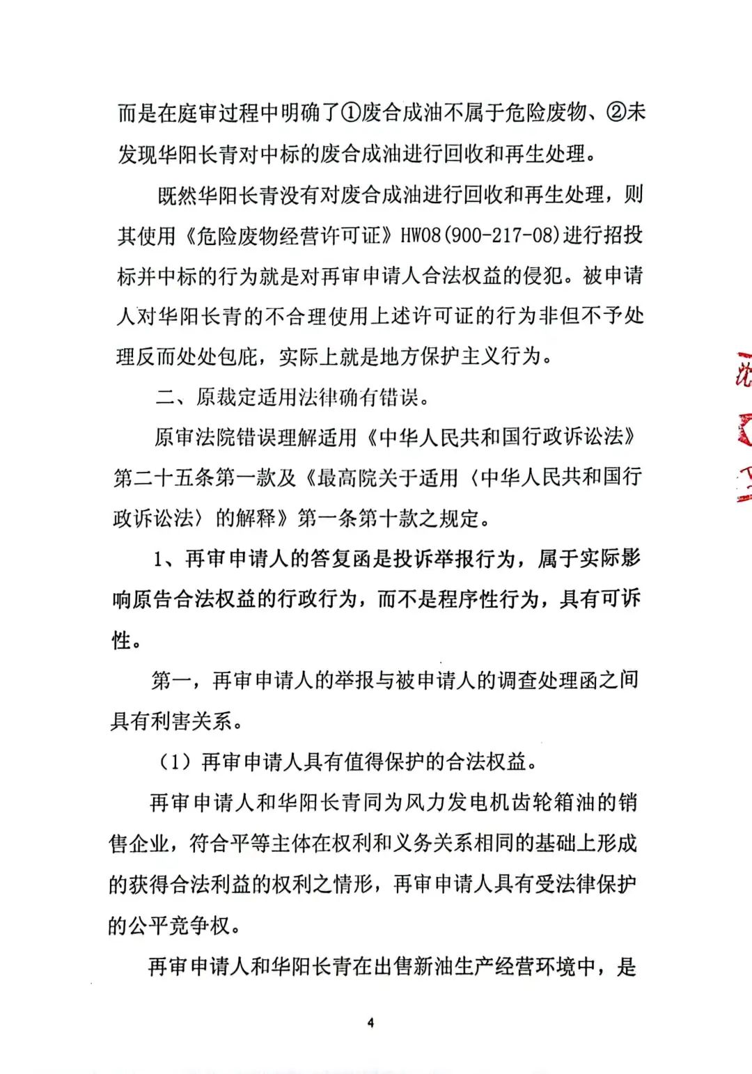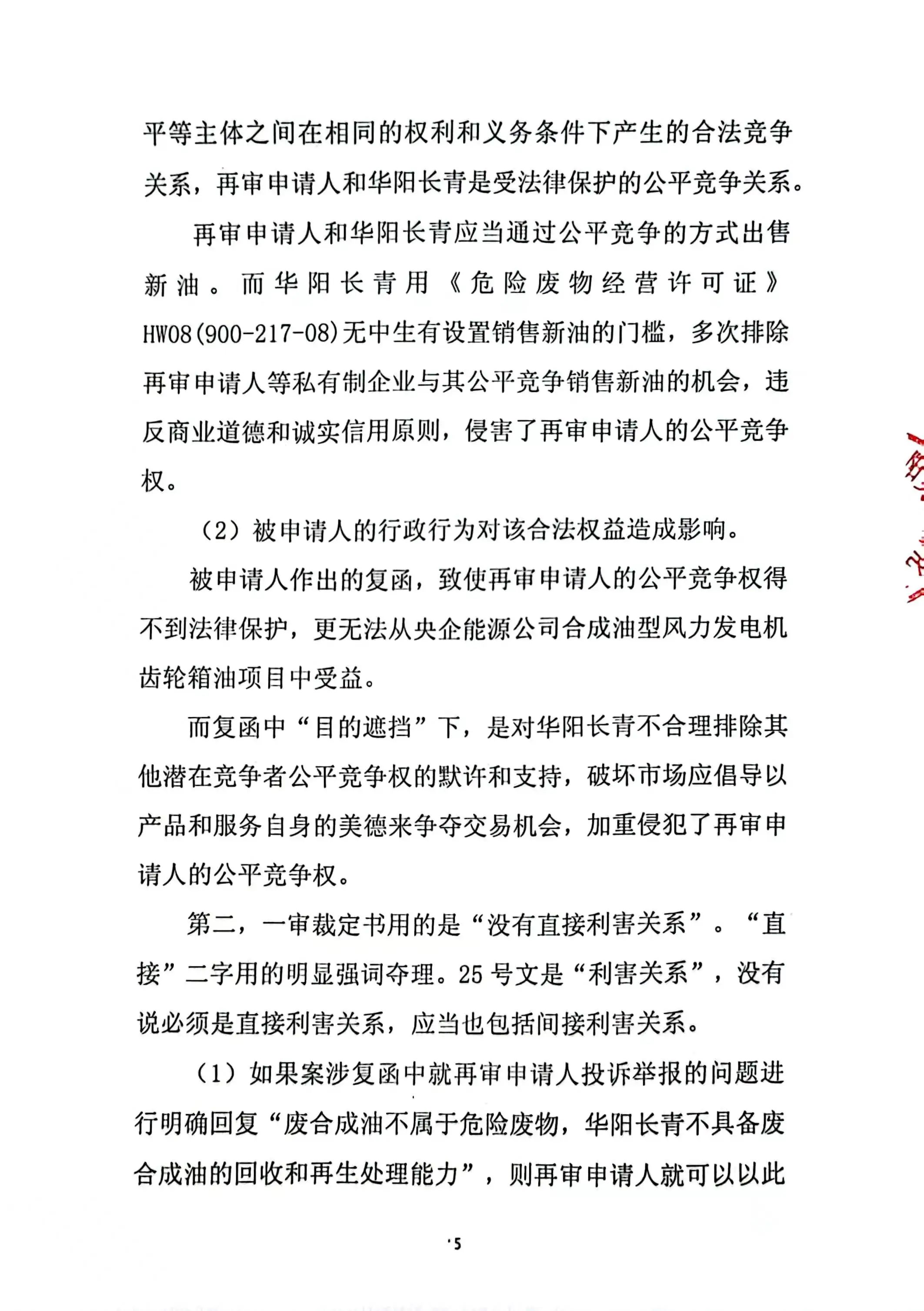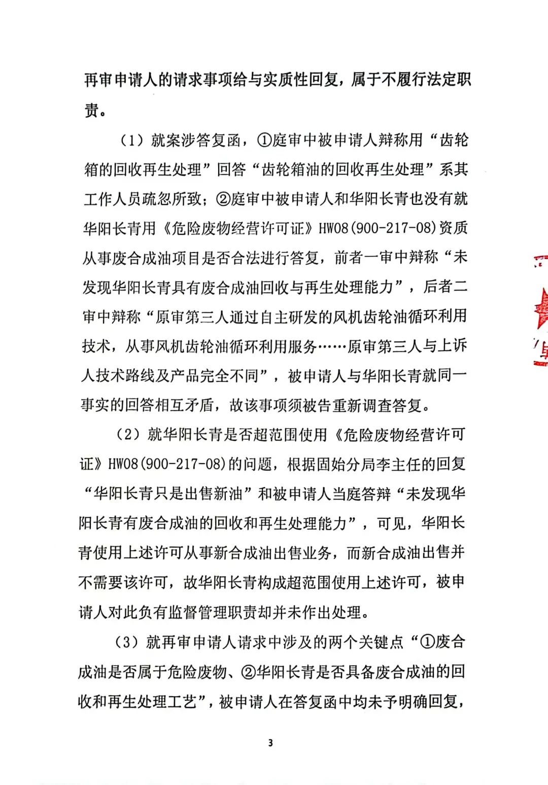 奧吉娜公司在再審申請中再次要求對兩個關(guān)鍵問題進(jìn)行法庭調(diào)查:1、《調(diào)查處理函》中的回答是錯誤的。信陽市生態(tài)環(huán)境局依據(jù)《國家危險廢物名錄(2021版)》認(rèn)定廢合成油不屬于危險廢物,不需要《危險廢物許可證》這種回答是錯誤的,而且作為一個市級行政職能部門信陽市生態(tài)環(huán)境局也無權(quán)作出這種認(rèn)定。2、根據(jù)奧吉娜公司對目前廢合成型風(fēng)電潤滑油再生技術(shù)的了解,華陽長青公司不具備廢合成型風(fēng)電潤滑油的再生能力,所謂的再生處理存在造假和欺騙的嫌疑!