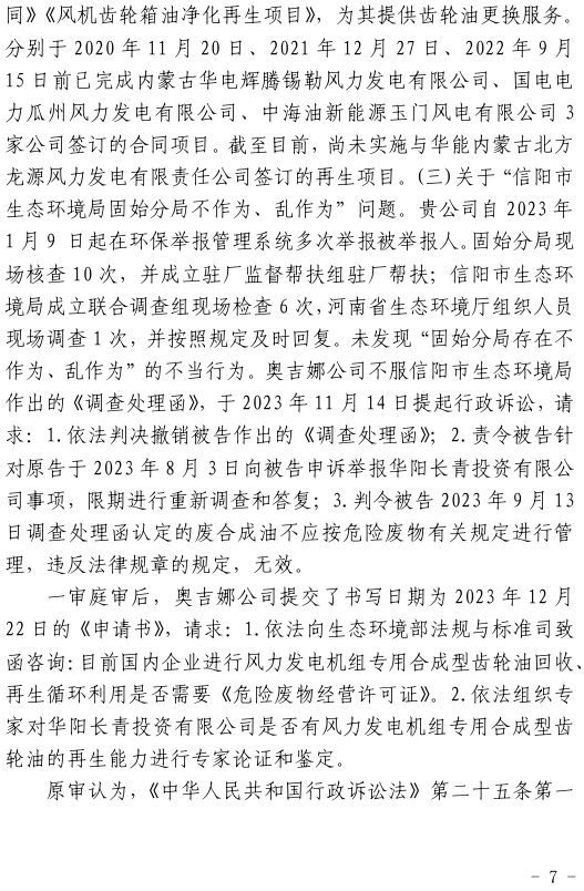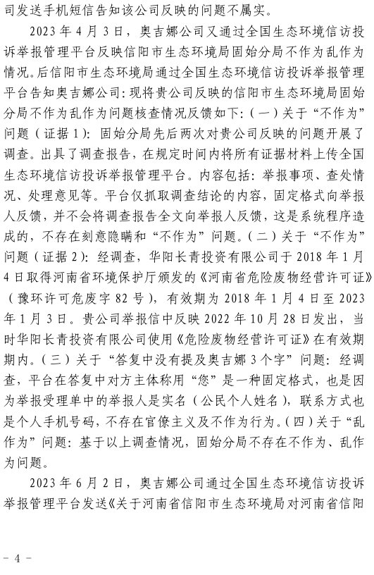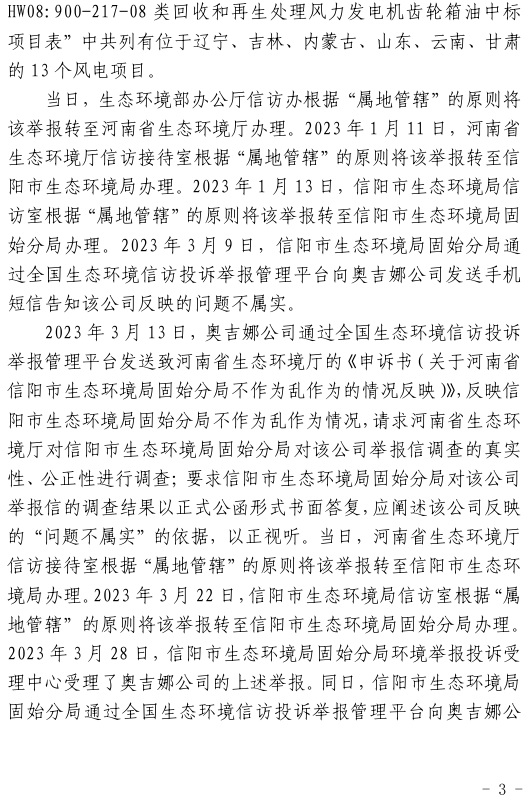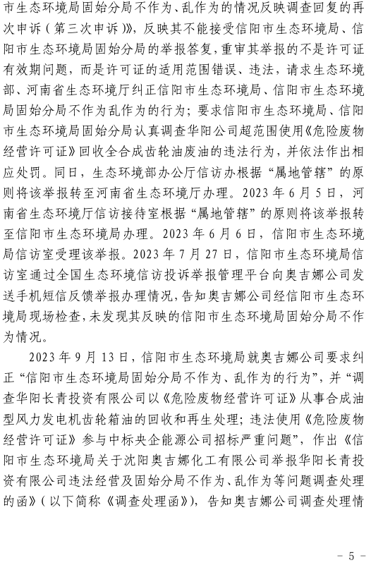 2023年3月9日,奧吉娜公司收到固始分局通過12369環(huán)境信訪平臺的短信答復(fù):“反映問題不屬實”。3月10日,奧吉娜公司向固始分局負(fù)責(zé)人電話詢問,其解釋稱:經(jīng)調(diào)查核實,華陽長青公司沒有再生風(fēng)電潤滑油銷售,出售的是新油。否定了奧吉娜公司的舉報內(nèi)容。對此,奧吉娜公司表示強烈不滿。3月11日,奧吉娜公司向環(huán)境部投訴固始分局的不作為和亂作為。2023年5月26日,奧吉娜公司收到12369環(huán)境信訪平臺的短信答復(fù)。答復(fù)部門為信陽環(huán)境局。令人啼笑皆非的是,答復(fù)稱,華陽長青的許可證有效期沒有問題,與舉報內(nèi)容風(fēng)馬牛不相及。2023年6月13日,奧吉娜公司再次向環(huán)境部提出申訴,指出,奧吉娜舉報的不是許可證有效期問題,而是許可證的適用范圍錯誤、違法。2023年7月27日,奧吉娜公司收到回復(fù)稱,經(jīng)信陽市生態(tài)環(huán)境局現(xiàn)場檢查,未發(fā)現(xiàn)固始分局不作為情況。2023年8月3日,奧吉娜公司向河南省生態(tài)環(huán)境廳(以下稱:環(huán)境廳)舉報信陽環(huán)境局包庇固始分局的行為。環(huán)境廳對此高度重視,有關(guān)處長和奧吉娜公司負(fù)責(zé)人進(jìn)行了面談。2023年9月13日,信陽環(huán)境局向奧吉娜公司致《信陽市生態(tài)環(huán)境局關(guān)于沈陽奧吉娜化工有限公司舉報華陽長青投資有限公司違法經(jīng)營及固始分局不作為、亂作為等問題調(diào)查處理的函》。函中:一是,以“齒輪箱”替換“齒輪箱油”,偷換概念;二是,做出了廢風(fēng)電合成(齒輪)油不屬于危險廢物的結(jié)論;三是,未發(fā)現(xiàn)固始分局存在不作為、亂作為的不當(dāng)行為。再次否定奧吉娜公司的舉報和投訴。