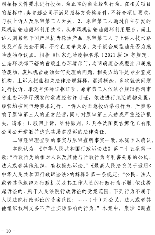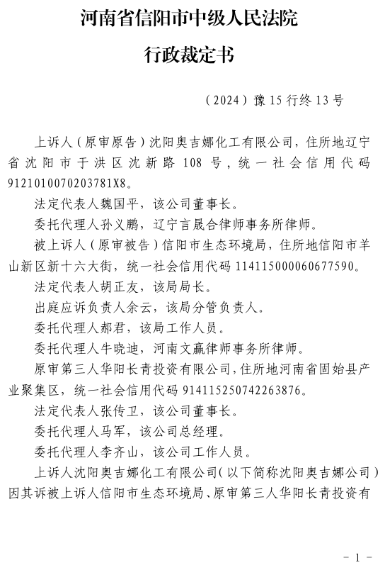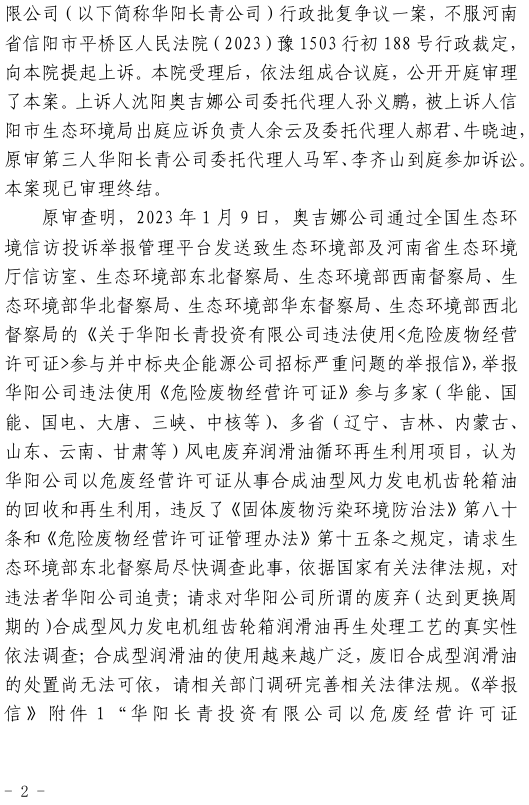 中國電力網(wǎng)訊 中國風(fēng)電潤滑油龍頭企業(yè)沈陽奧吉娜化工有限公司(下簡稱:奧吉娜公司或上訴人)訴信陽市生態(tài)環(huán)境局(被上訴人)和第三人華陽長青投資有限公司(下簡稱:華陽長青公司)行政訴訟案,河南省信陽市中級人民法院于2024年4月2日作出二審行政裁定:駁回上訴,維護(hù)原裁定。