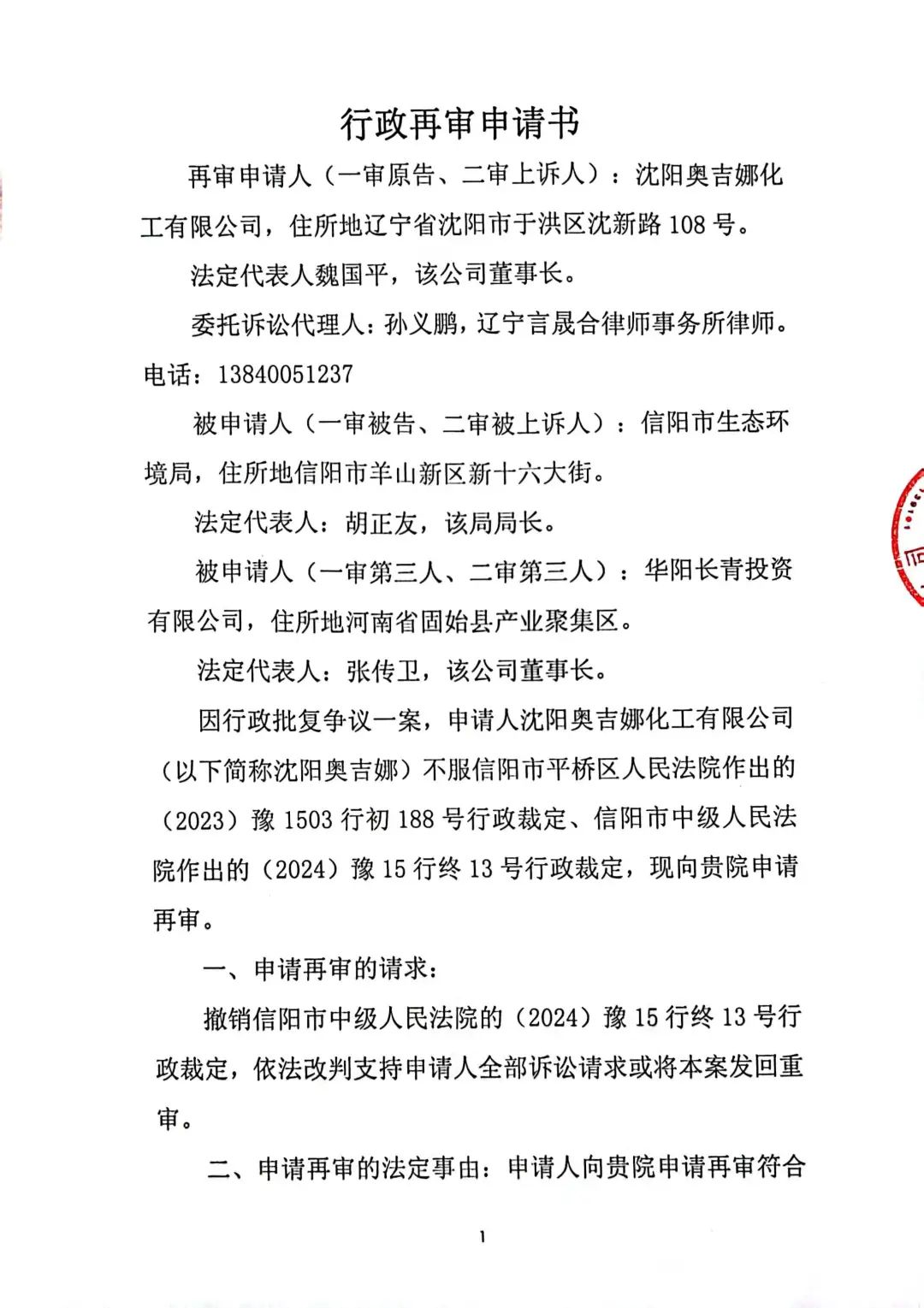 2024年4月2日,河南省信陽市中級人民法院裁定:駁回上訴,維持原裁定[裁定書號(2024)豫15行終13號]。奧吉娜公司不服裁定,2024年4月19日向河南省高級人民法院遞交《行政再審申請書》,申請再審。