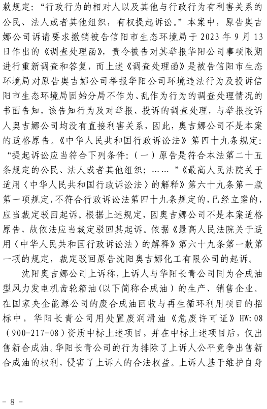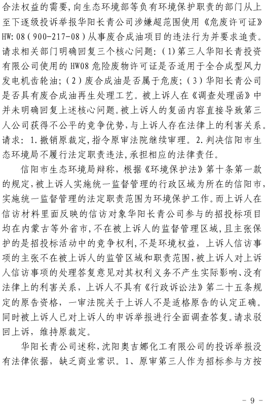 2、一審訴訟請求:請求人民法院判決撤銷被告作出的《信陽市生態(tài)環(huán)境局關(guān)于沈陽奧吉娜化工有限公司舉報華陽長青投資有限公司違法經(jīng)營及固始分局不作為、亂作為等問題調(diào)查處理的函》;責(zé)令被告對原告向被告舉報華陽長青投資有限公司事項,限期進(jìn)行重新調(diào)查和答復(fù);判令被告認(rèn)定的廢合成油不應(yīng)按危險廢物有關(guān)規(guī)定進(jìn)行管理違反法律規(guī)章規(guī)定,無效。