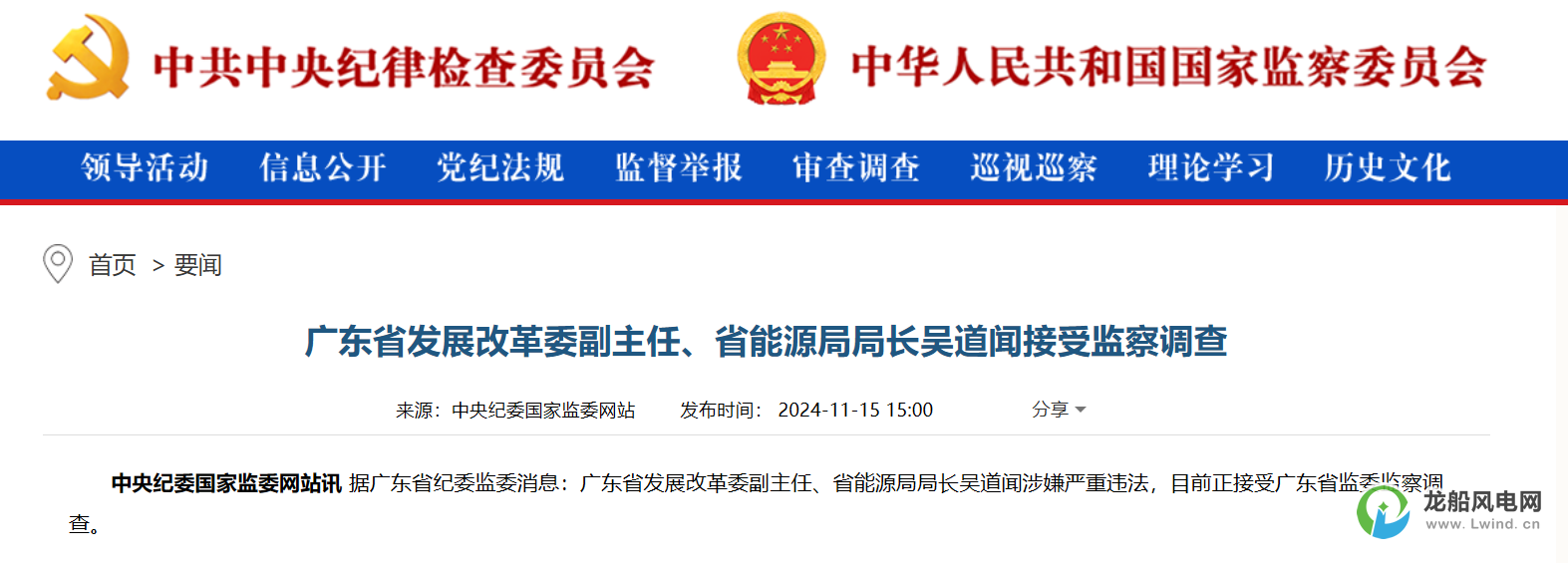 11月15日,中央紀(jì)委國(guó)家監(jiān)委網(wǎng)站訊 據(jù)廣東省紀(jì)委監(jiān)委消息:廣東省發(fā)展改革委副主任、省能源局局長(zhǎng)吳道聞涉嫌嚴(yán)重違法,目前正接受廣東省監(jiān)委監(jiān)察調(diào)查。