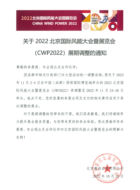 根據(jù)成都市相關(guān)行政部門對(duì)大型活動(dòng)統(tǒng)一調(diào)整安排,原定于2022年11月2-4日在中國(guó)(成都)西部國(guó)際博覽城舉辦的2022北京國(guó)際風(fēng)能大會(huì)暨展覽會(huì)(CWP2022)將調(diào)整至2022年11月24-26日舉辦,地點(diǎn)不變。
