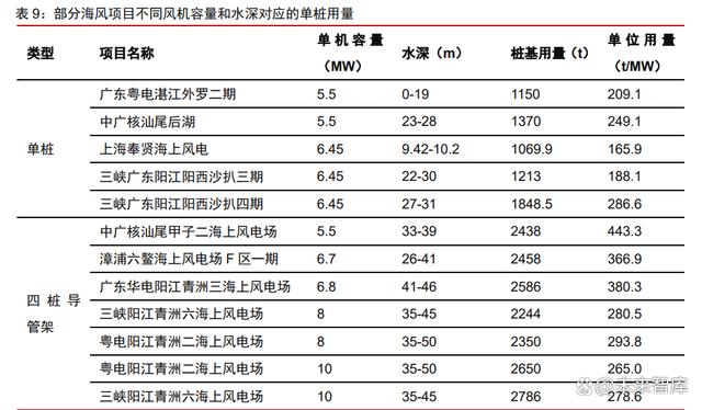 風電大型化和深?;苿訕痘?、塔筒單機用量增長。據海力風電招股書,適用于 0- 24m 水深單機容量 4MW 的單樁基礎重量在每臺 550-1000 噸之間;水深 30m 以上單機 容量 5MW 使用的四樁導管架基礎重量為 243 噸。以三峽陽江沙扒三期和三峽陽江青洲六 項目對比測算樁基塔筒單機用量,陽江沙扒三期安裝單機容量 6.45MW 風機 62 臺,陽江 青洲六分別安裝 8MW 和 10MW 容量風機 25 和 80 臺,風機葉片直徑、輪轂高度數值均增 大,單臺塔筒和樁基用量為 734 噸和 2657 噸,較淺水域小容量風機項目對應的 380 噸和 1693 噸用量提升。