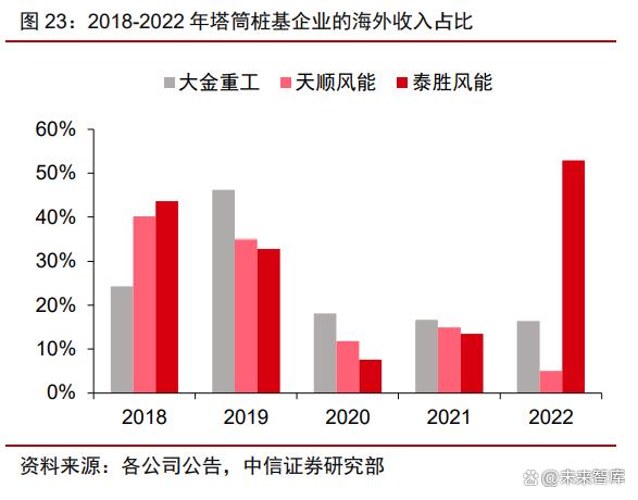 國內(nèi)企業(yè)塔筒出海勢頭加速,單樁出口實現(xiàn)突破。大金重工、天順風(fēng)能、泰勝風(fēng)能的 出口比例接近,國內(nèi)企業(yè)以出口塔筒產(chǎn)品為主,海外客戶的供應(yīng)商體制使有出口業(yè)績的公 司具備更好的客戶端優(yōu)勢;樁基因運輸效率低和方案不成熟的問題,需求仍主要由海外本 地產(chǎn)能滿足。根據(jù)大金重工公告,公司憑其基礎(chǔ)設(shè)施、港口條件和工藝裝備和對海外業(yè)務(wù) 的加大投入,于 2022 年攬入 6 項海風(fēng)海外項目,包括 5 項歐洲項目,成為國內(nèi)首家管樁 產(chǎn)品出口歐洲的企業(yè),打開國產(chǎn)樁基的歐洲市場。