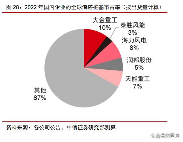 海風(fēng)基礎(chǔ)高壁壘高門檻,國內(nèi)行業(yè)格局集中。與陸上塔筒的分散格局不同,由于海上 塔筒樁基所需碼頭資源的緊缺和產(chǎn)能布局的重要性,國內(nèi)目前從事海風(fēng)塔筒和樁基生產(chǎn)的 企業(yè)較少,大金重工、海力風(fēng)電、天順風(fēng)能、潤邦股份和泰勝風(fēng)能為主的少數(shù)領(lǐng)先企業(yè)貢 獻(xiàn)國內(nèi)的主要行業(yè)產(chǎn)能。我們根據(jù)出貨量測算,2022 年主導(dǎo)企業(yè)海力風(fēng)電、大金重工、 泰勝風(fēng)能、天能重工、潤邦股份的海上塔筒和樁基的全球市占率合計約 30%。