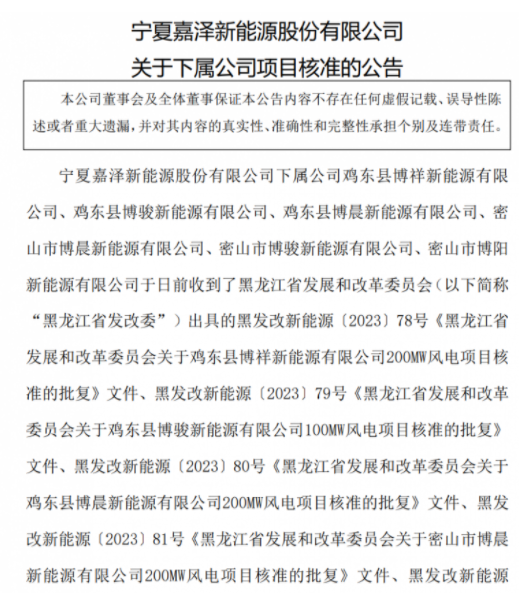 公告披露,寧夏嘉澤新能源股份有限公司下屬公司于日前收到了黑龍江省發(fā)展和改革委員會(huì)(以下簡(jiǎn)稱“黑龍江省發(fā)改委”)出具的風(fēng)電項(xiàng)目核準(zhǔn)的批復(fù)文件,共計(jì)六個(gè)風(fēng)電項(xiàng)目獲得核準(zhǔn),總裝機(jī)容量為1100MW。