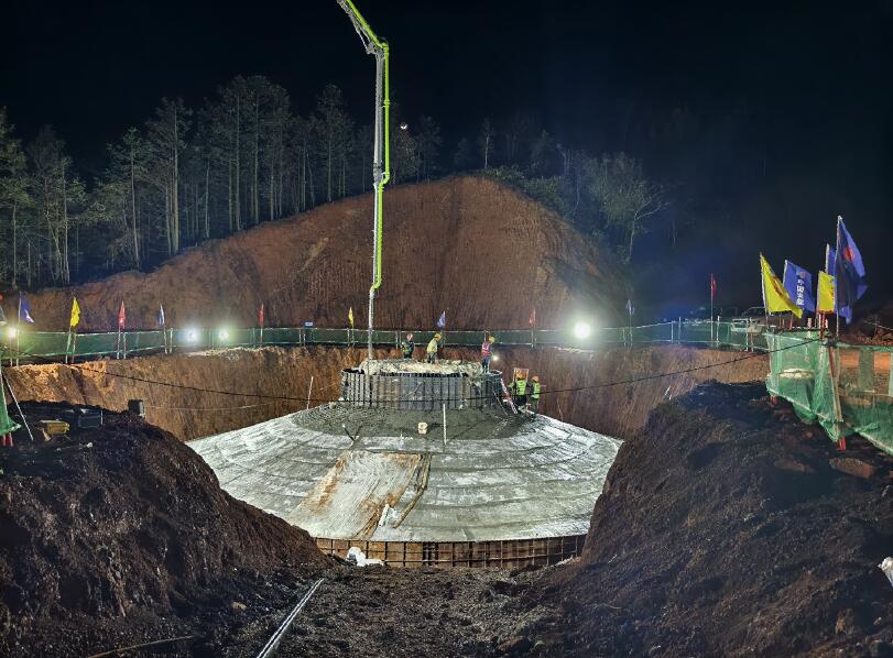 首臺(tái)風(fēng)機(jī)基礎(chǔ)澆筑在風(fēng)電項(xiàng)目施工中具有里程碑的意義,直接影響后續(xù)吊裝及發(fā)電目標(biāo)。為確保澆筑工作安全順利完成,針對(duì)四號(hào)機(jī)位運(yùn)輸?shù)缆窂?fù)雜、天氣雨多霧大的實(shí)際情況,項(xiàng)目部召開(kāi)專題部署會(huì),合理安排人員及保障設(shè)備,細(xì)化任務(wù)分工到個(gè)人,編制專項(xiàng)措施,有力保障混凝土順利澆筑。全體施工人員充分發(fā)揚(yáng)鐵軍精神,克服天氣及夜間施工等不利因素,經(jīng)過(guò)18個(gè)半小時(shí)的晝夜奮戰(zhàn),順利完成首基澆筑,得到業(yè)主和監(jiān)理的一致肯定。