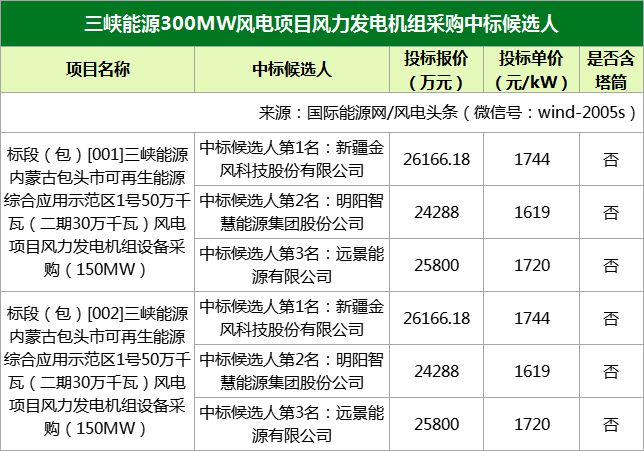 三峽能源內(nèi)蒙古包頭市可再生能源綜合應(yīng)用示范區(qū)1號50萬千瓦(二期30萬千瓦)風(fēng)電項目分為兩個標(biāo)段,標(biāo)段一和標(biāo)段二中標(biāo)候選人分別為金風(fēng)科技、明陽智能、遠(yuǎn)景能源。