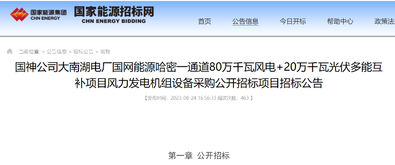 公告顯示,國網(wǎng)能源哈密一通道80萬千瓦風(fēng)電+20萬千瓦光伏多能互補項目場址位于新疆哈密大南湖地區(qū),工程場址中心距哈密市直線距離約96km,呈不規(guī)則多邊形,占地面積約165.05km²,風(fēng)電場擬安裝128臺6.25MW風(fēng)力發(fā)電機組,總裝機容量800MW,共分為兩個標段:A標段400MW,B標段400MW。本項目計劃于2023年9月30日前開工(暫定);2024年6月30日前全容量并網(wǎng)發(fā)電。(暫定)
