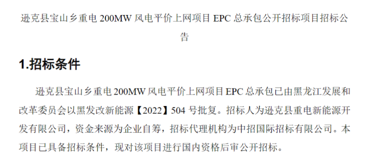 近日,中國(guó)招標(biāo)投標(biāo)公共服務(wù)平臺(tái)發(fā)布《遜克縣寶山鄉(xiāng)重電200MW風(fēng)電平價(jià)上網(wǎng)項(xiàng)目EPC總承包-招標(biāo)公告》。