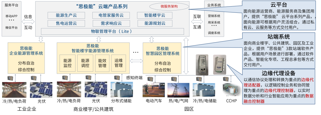 國網(wǎng)信通產(chǎn)業(yè)集團(tuán)依托“云-網(wǎng)-邊-端-芯-智-鏈”的信息通信全產(chǎn)業(yè)鏈體系,開發(fā)以“思極能”品牌為核心的智慧能源服務(wù)軟硬件產(chǎn)品,滿足能源運(yùn)營商/服務(wù)商、能源消費(fèi)者、能源產(chǎn)品商、政府等多元化用戶的綜合能源需求,打造智慧樓宇、智慧園區(qū)等典型CPS(信息物理系統(tǒng))場景的“智腦+神經(jīng)系統(tǒng)”,實(shí)現(xiàn)客戶側(cè)能源系統(tǒng)的安全、高效、低碳運(yùn)行。