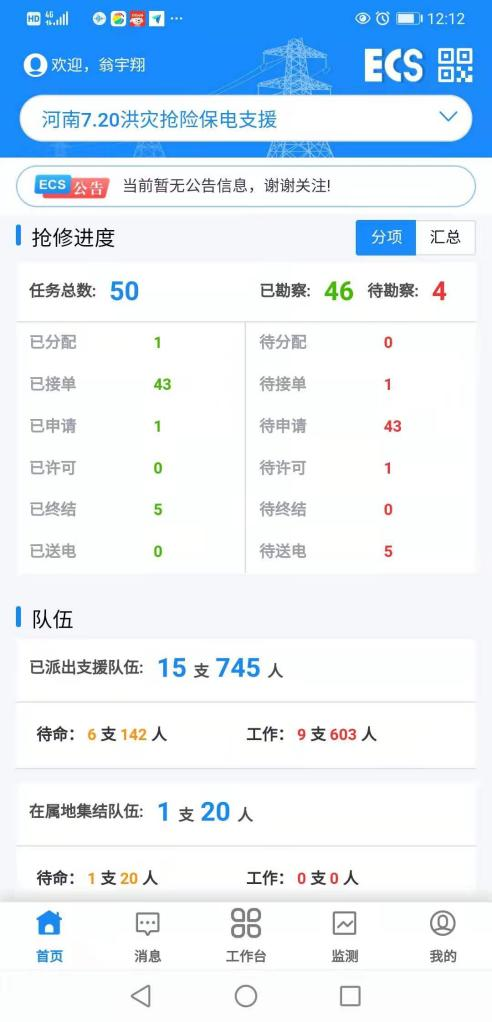 ECS系統(tǒng)及閩電應(yīng)急app曾在防抗2020年第6號臺風(fēng)“米克拉”、2019年第11號臺風(fēng)“白鹿”等事件中出色完成國網(wǎng)福建電力抗臺保電任務(wù),作為應(yīng)急管理系統(tǒng)的一名“老手”,ECS系統(tǒng)及閩電應(yīng)急app在河南電網(wǎng)搶修這個(gè)“新戰(zhàn)場”完成了優(yōu)化升級,在短短兩天內(nèi)針對河南現(xiàn)場搶修特點(diǎn)上線新模塊,模塊支持跨省隊(duì)伍調(diào)派、任務(wù)單下發(fā)、現(xiàn)場信息勘察及回傳、物資需求提報(bào)以及搶修信息統(tǒng)計(jì)等功能。