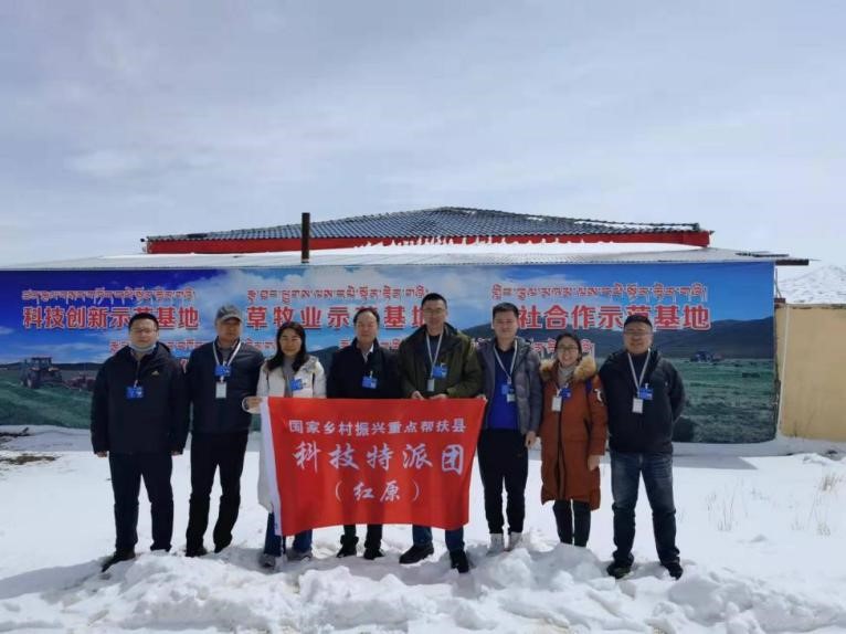 圖:紅原科技特派團(tuán)在塘日村牦牛養(yǎng)殖合作社前合影