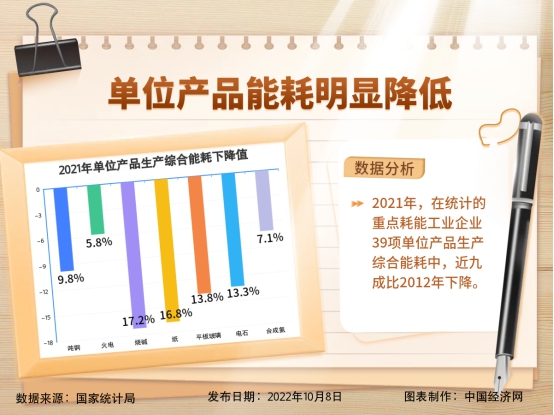 通過推動工藝升級、更新改造用能設備、加快淘汰落后產(chǎn)能、推廣高效節(jié)能技術,單位產(chǎn)品綜合能耗不斷下降。2021年,在統(tǒng)計的重點耗能工業(yè)企業(yè)39項單位產(chǎn)品生產(chǎn)綜合能耗中,近九成比2012年下降。其中,噸鋼綜合能耗下降9.8%,火力發(fā)電煤耗下降5.8%,燒堿、機制紙及紙板、平板玻璃、電石、合成氨生產(chǎn)單耗分別下降17.2%、16.8%、13.8%、13.3%、7.1%。