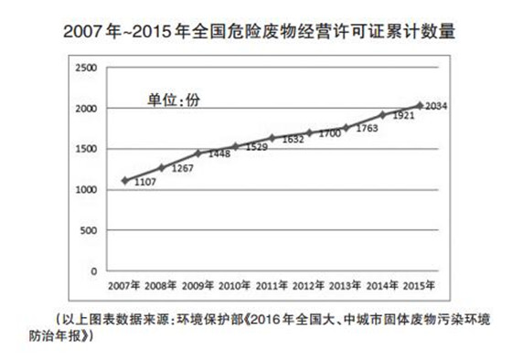 環(huán)境保護(hù)部近日公布的《2016年全國大、中城市固體廢物污染環(huán)境防治年報》(以下簡稱《2016年報》)顯示,全國危險廢物處理能力明顯提高,截至2015年底,各省(區(qū)、市)累計頒發(fā)的危險廢物(含醫(yī)療廢物)經(jīng)營許可證共2034份,比2014年增加113份,全國危險廢物經(jīng)營單位核準(zhǔn)危廢處理能力達(dá)5263萬噸/年,較同期提高959萬噸/年。