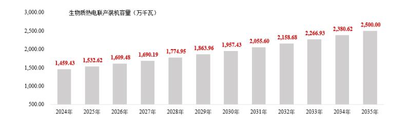 根據(jù)國(guó)家發(fā)展改革委、國(guó)家能源局發(fā)布的《關(guān)于促進(jìn)生物質(zhì)能供熱發(fā)展的指導(dǎo)意見》(發(fā)改能源[2017]2123號(hào)),到2035年,生物質(zhì)熱電聯(lián)產(chǎn)裝機(jī)容量超過2500萬千瓦,生物質(zhì)能供熱在具備資源條件的地區(qū)實(shí)現(xiàn)普及應(yīng)用。根據(jù)該指導(dǎo)意見確定的目標(biāo),未來生物質(zhì)熱電聯(lián)產(chǎn)裝機(jī)容量預(yù)計(jì)發(fā)展情況如下: