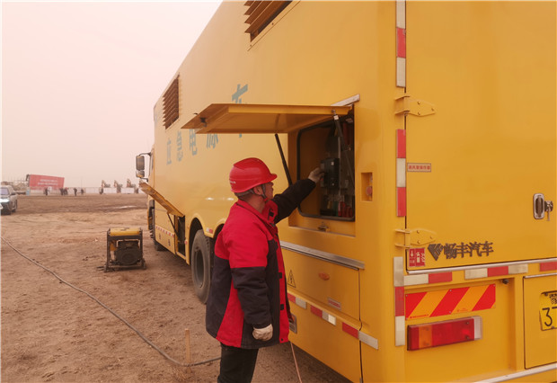 開工儀式當天沙塵天氣持續(xù),揚沙隨風彌漫,突擊隊的保電人員不辭辛苦一大早便提前進入會場。將發(fā)電車??吭谇捌诓榭钡闹付ㄎ恢?,做好安全監(jiān)護相關的工作之后,啟動車輛試運行,檢查了各項儀表數(shù)據(jù),并做好與用戶側(cè)供電設備的對接,全力以赴投入保電工作。該分局領導帶領保電人員全程守候在現(xiàn)場,隨時應對突發(fā)停電事故的發(fā)生,確保了開工儀式用電萬無一失。