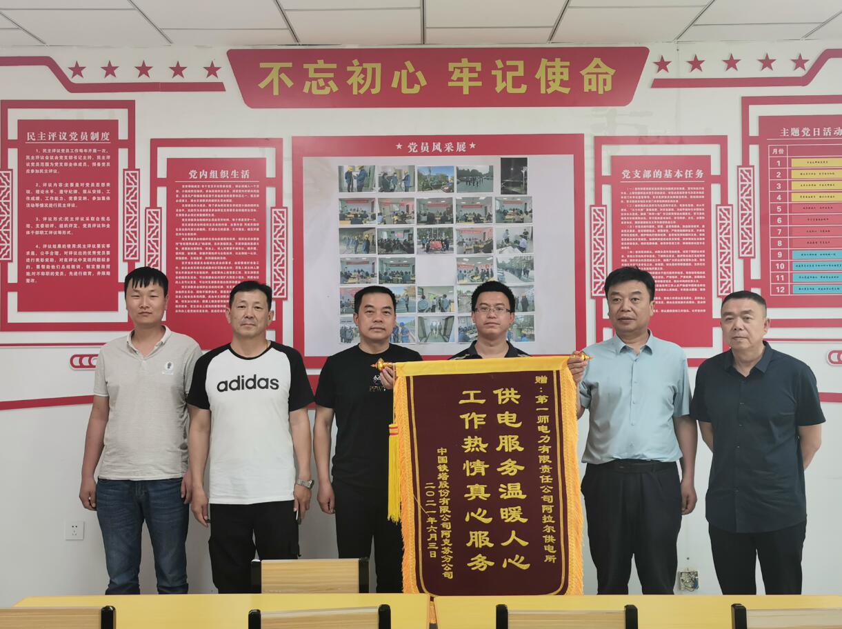 中國鐵塔阿克蘇分公司負責人蔣羽將一面寫著“供電服務溫暖人心·工作熱情真心服務”的錦旗送到一師電力阿拉爾供電所負責人手中,對他們優(yōu)質(zhì)、高效的供電服務贊不絕口。
