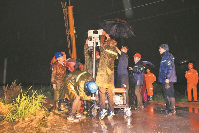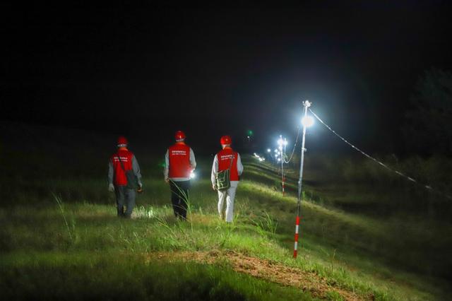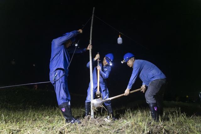 運(yùn)輸材料、組裝燈泡、打樁架線、爬桿送電……突擊隊員們克服雜草叢生、滿是泥濘的不利工作條件,于7月1日6時“點亮”江心鄉(xiāng)堤壩。據(jù)統(tǒng)計,突擊隊員們共計安裝防雨戶外燈300余盞,敷設(shè)照明臨時線路約12千米。