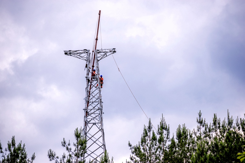 中國電力網(wǎng)訊   6月10日,室外氣溫高達28攝氏度,在四川省巴中市通江縣陳河鎮(zhèn)下江口村10社,國網(wǎng)通江縣供電公司施工人員有序開展涪陽變電站一河壩1井線路15號鐵塔組立工作。據(jù)了解,國網(wǎng)四川省巴中市通江縣供電公司積極服務地方經(jīng)濟發(fā)展,開辟供電服務綠色通道,從報裝申請、供電方案確定等方面提供優(yōu)質(zhì)高效的“一條龍”辦電服務,為重點項目建設提供用電保障。程聰攝