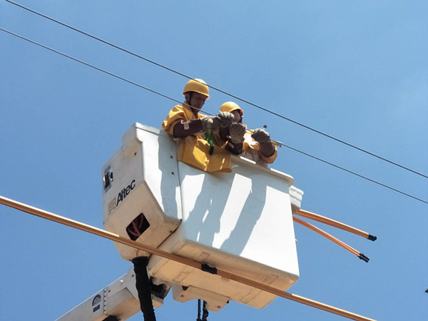 在排查好停電事故原因后,現(xiàn)場搶修人員開始積極的搶修線路工作,在搶修車輛到達(dá)現(xiàn)場,搶修人員安全措施執(zhí)行到位后,搶修人員帶電作業(yè)修復(fù)導(dǎo)線。雖然才上午11時許,但室外的溫度就已經(jīng)達(dá)到37攝氏,搶修人員登上升降車,在保證安全,規(guī)范操作的情況下,開始了導(dǎo)線的修復(fù)工作,搶修現(xiàn)場有序進(jìn)行,在高溫酷暑的烈日下,經(jīng)過了45分鐘的揮汗如雨緊急搶修,終于恢復(fù)了10KV市山官樁支線的正常運行。搶修人員在完成工作后,脫去了厚重的安全工作服,自己的衣服已經(jīng)早已被汗水浸濕,望著他們身影,感嘆工作在一線搶修的師傅們真不容易,心中由衷的敬佩他們。(萬婉/文)(胡志強/圖)