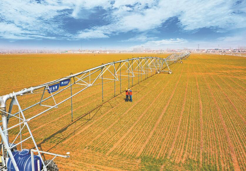 驚蟄過(guò)后,我國(guó)重要的商品糧基地豫東平原進(jìn)入春灌高峰期。3月13日一早,河南省虞城縣站集鎮(zhèn)西北街村的千畝高標(biāo)準(zhǔn)農(nóng)田中,村民盧合軍拉下電閘,啟動(dòng)水泵,5臺(tái)卷盤(pán)式電動(dòng)噴灌機(jī)緩慢移動(dòng),將密集的水霧灑向麥苗。“現(xiàn)在冬小麥迅速拔節(jié),澆完這遍水,我還要再?lài)娨淮纬輨?。今年畝產(chǎn)預(yù)計(jì)能超過(guò)1000斤。”盧合軍對(duì)前來(lái)巡檢農(nóng)田機(jī)井用電設(shè)施的虞城縣供電公司站集供電所員工趙成海說(shuō)。