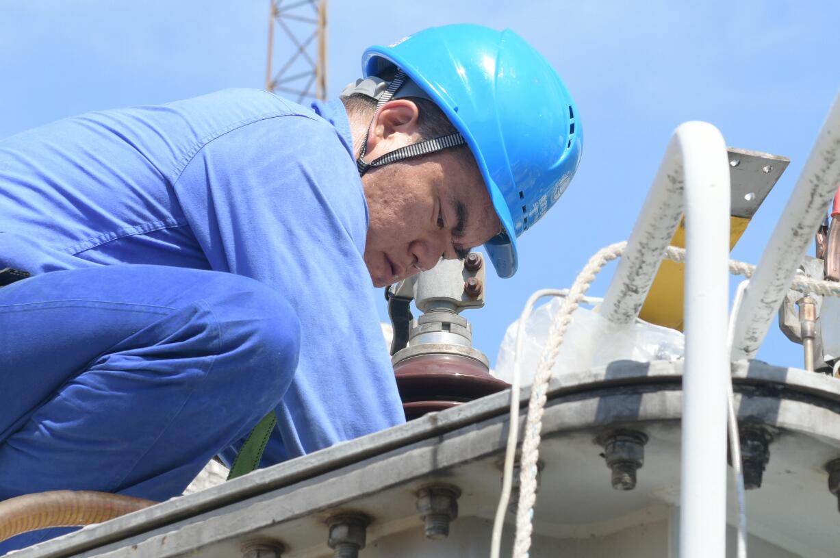 刺眼的烈日給檢修工作帶來不少影響,此時主變上的溫度已近50度,檢修人員們克服高溫穩(wěn)步推進各項工作,不一會兒曬紅的臉頰也掛滿了汗水,衣服也被浸濕。隨著檢修人員將分接開關(guān)裝復(fù)、充油,完成主變診斷性試驗,至20點37分,全部工作順利完成。