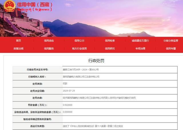 國(guó)網(wǎng)江達(dá)縣供電公司被罰款 9100元