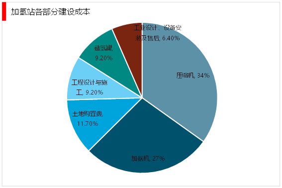 加氫站主要由制氫系統(tǒng)、壓縮系統(tǒng)、儲(chǔ)存系統(tǒng)、加注系統(tǒng)和控制系統(tǒng)等部分組成。從成本結(jié)構(gòu)來(lái)看,壓縮機(jī)成本和土地購(gòu)置費(fèi)的成本占比最高,分別為34%和27%;儲(chǔ)氫罐成本占比11.7%;加氫機(jī)成本占比9.2%。