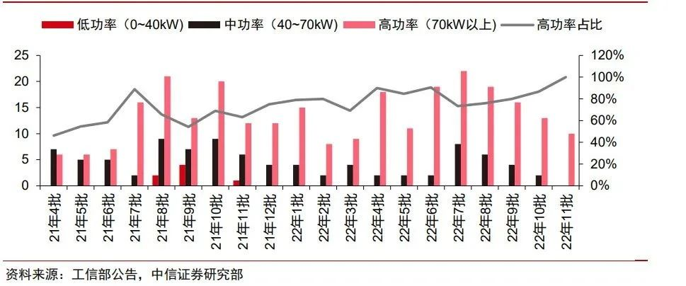 工信部推薦車型高功率化趨勢明顯,這與燃料電池快速的產(chǎn)品迭代與使用需求相關(guān),當(dāng)下主要的應(yīng)用場景是長途客運(yùn)、干線物流、礦山、港口等場景,主流的燃料電池廠商都在不斷推高新產(chǎn)品的功率,打造燃料電池汽車大功率的優(yōu)勢以滿足下游應(yīng)用場景的需求,在鋼鐵廠、礦山等短途倒轉(zhuǎn)場景下,120~130kW的系統(tǒng)即可滿足類似需求,但是長途重載、干線物流由于路況和地形條件更為復(fù)雜,則需要系統(tǒng)功率提升至250~300kW。