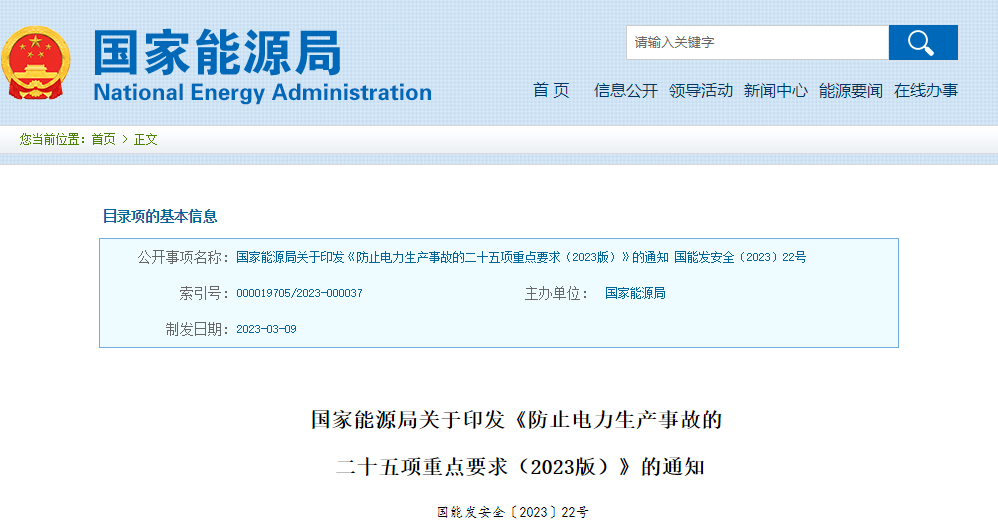 國家能源局關(guān)于印發(fā)《防止電力生產(chǎn)事故的二十五項重點要求(2023版)》的通知
