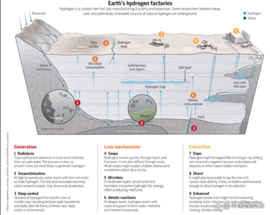 (圖片描述:氫是如何在地下形成的。來(lái)源:《科學(xué)》期刊的“隱藏的氫氣:地球上有大量可再生無(wú)碳燃料嗎?”)