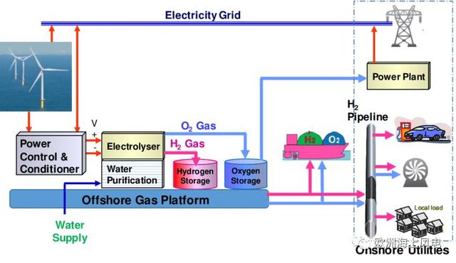 Dolphyn則是由ERM公司開發(fā)的、基于浮式風(fēng)電的電解制氫技術(shù),即在浮式風(fēng)機(jī)平臺(tái)上配置制氫設(shè)備,風(fēng)機(jī)發(fā)電就地制氫,然后通過管道將氫氣輸送到岸上。