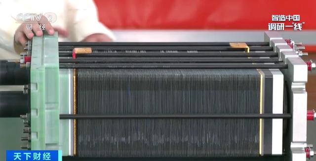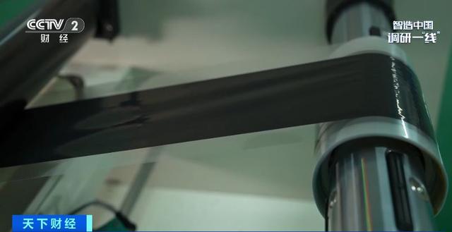 一條產(chǎn)線正在進行膜電極的生產(chǎn),制作過程就是將催化劑均勻涂在質(zhì)子交換膜的兩側(cè)。這條產(chǎn)線的催化劑只有3微米厚,相當于正常頭發(fā)絲的二十分之一。它可以使生產(chǎn)的膜電極更薄、重量更輕,從而降低整個電堆的厚度,提高功率。目前,這條產(chǎn)線可以實現(xiàn)每天生產(chǎn)1萬片膜電極。