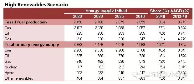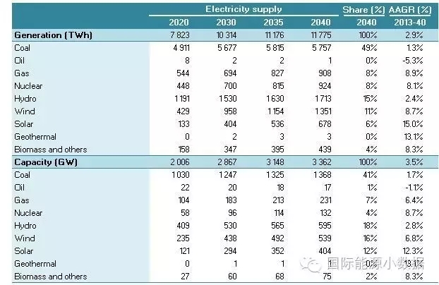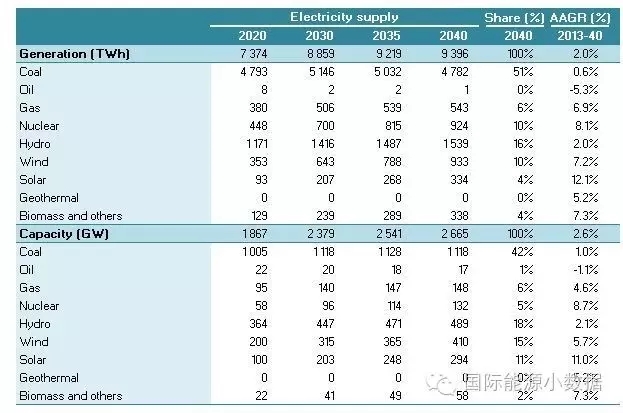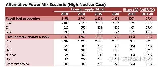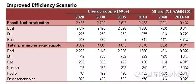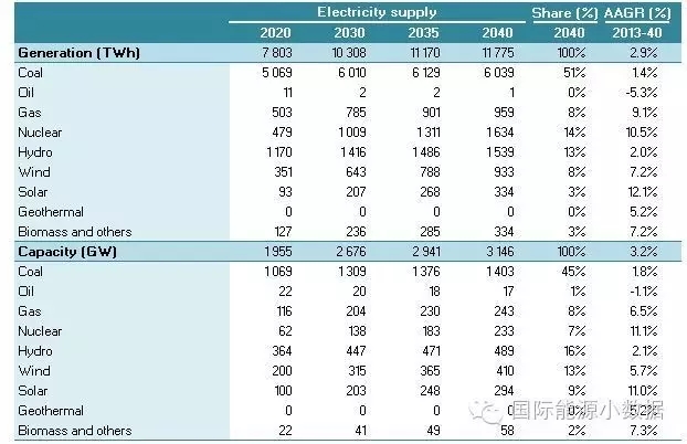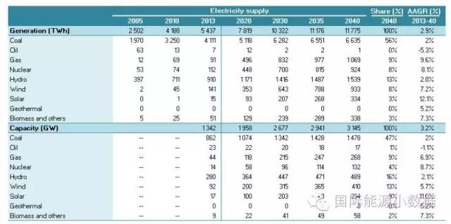 在大大提高能效的情境下,2040年一次能源供應只有38.78億噸標油,其中煤炭仍占48%、石油16%、天然氣11%、核電6%、水電3%、非水可再生能源14%。從發(fā)電量來看,2040年總裝機達2665吉瓦,發(fā)電量達9.39萬億千瓦時,煤電占51%、天然氣發(fā)電6%、核電10%、水電16%、風電 10%、光伏4%、生物質4%。