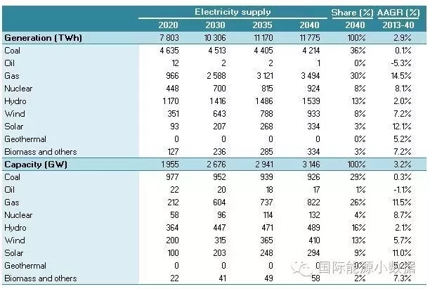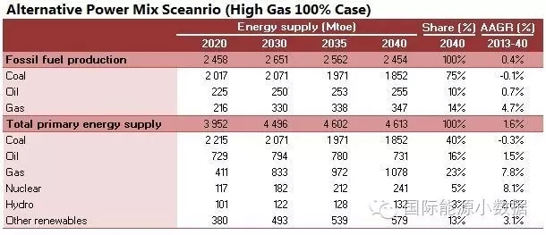 在大力推廣天然氣發(fā)電的情境下,2040年一次能源供應為46.13億噸標油,其中煤炭跌至40%、石油16%、天然氣高達23%、核電5%、水電3%、非水可再生能源13%。從發(fā)電量來看,2040年總裝機達3146吉瓦,發(fā)電量達11.78萬億千瓦時,煤電占36%、天然氣發(fā)電30%、核電8%、水電 13%、風電8%、光伏3%、生物質3%。
