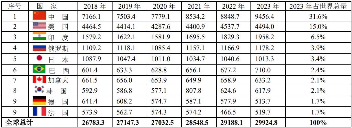 全球發(fā)電量最多的前十位國(guó)家(單位:TWh)