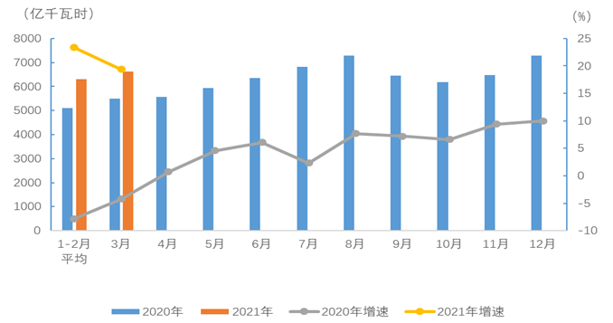 1-3月,全國全社會(huì)用電量19219億千瓦時(shí),同比增長21.2%,其中,3月份全國全社會(huì)用電量6631億千瓦時(shí),同比增長19.4%。