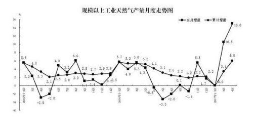 1-4月份,天然氣產(chǎn)量509.4億立方米,同比增長6.0%。進口2011萬噸[4],增長5.4%。