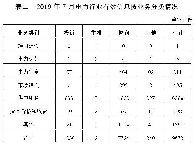 電力行業(yè)排在首位,有效信息數量為9673件,占全部有效信息的82.92%;其中受理的投訴舉報數量為1039件,占全部投訴舉報數量的96.38%。群眾反映的問題主要集中在供電服務、電力安全、成本價格和收費等方面。(2019年7月電力行業(yè)有效信息按業(yè)務分類情況見表二)