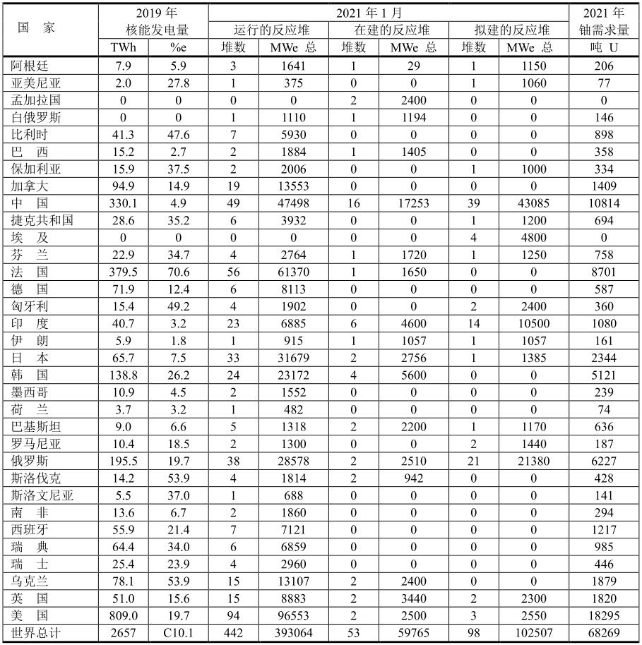 表中“%e”表示核能發(fā)電占發(fā)電總量的百分率。全球核能發(fā)電占全球發(fā)電總量的10.1%,其中法國高達70.6%。本數據是世界核能協(xié)會WNA 2021年1月份提供的數據。