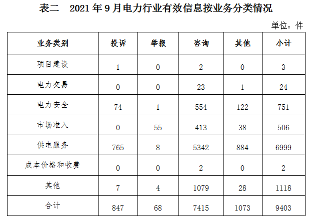 電力行業(yè)排在首位,有效信息數(shù)量為9403件,占全部有效信息的76.49%。群眾關(guān)注的內(nèi)容主要集中在有序用電、故障停電、供電安全等方面。(2021年9月電力行業(yè)有效信息按業(yè)務(wù)分類情況見表二)