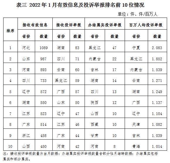各省(自治區(qū)、直轄市)按照接收的有效信息數(shù)量排序,河北、山東、河南、四川、遼寧、湖南、江蘇、廣東、浙江、山西排在全國(guó)前10位;按照接收的投訴舉報(bào)數(shù)量排序,湖南、四川、云南、黑龍江、廣西、山東、遼寧、江蘇、廣東、河南排在全國(guó)前10位;按照辦結(jié)屬實(shí)的投訴舉報(bào)數(shù)量排序,黑龍江、內(nèi)蒙古、吉林、湖南、四川、陜西、山西、西藏、甘肅、河南排在全國(guó)前10位;按照百萬(wàn)人均投訴舉報(bào)數(shù)量排序,寧夏、黑龍江、內(nèi)蒙古、云南、湖南、廣西、遼寧、天津、吉林、青海排在全國(guó)前10位。(2022年1月有效信息及投訴舉報(bào)排名前10位情況見表三)
