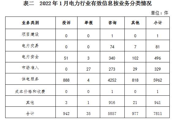 電力行業(yè)排在首位,有效信息數(shù)量為7811件,占全部有效信息的64.71%。群眾關(guān)注的內(nèi)容主要集中在故障停電、供電安全、電費(fèi)計(jì)量和收繳等方面。(2022年1月電力行業(yè)有效信息按業(yè)務(wù)分類情況見表二)