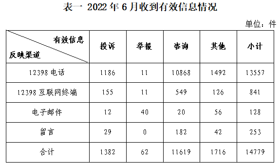 2022年6月,國(guó)家能源局12398能源監(jiān)管熱線(以下簡(jiǎn)稱(chēng)12398熱線)共收到有效信息14779件(包含投訴、舉報(bào)、咨詢(xún)和其他訴求類(lèi)別),環(huán)比增加43.12%,同比增加49.28%。(2022年6月收到有效信息情況見(jiàn)表一)