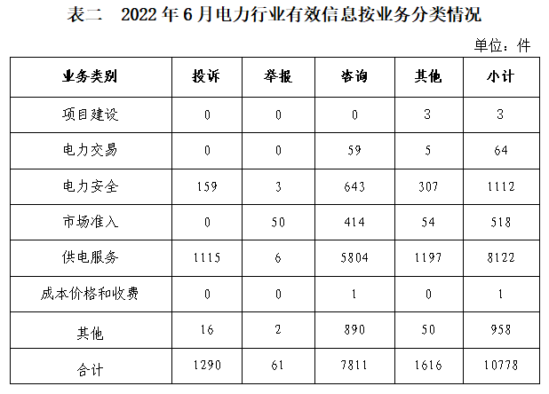 電力行業(yè)排在首位,有效信息數(shù)量為10778件,占全部有效信息的72.93%。群眾關(guān)注的內(nèi)容主要集中在供電服務(wù)、停電搶修、用戶(hù)受電工程市場(chǎng)秩序等方面。(2022年6月電力行業(yè)有效信息按業(yè)務(wù)分類(lèi)情況見(jiàn)表二)