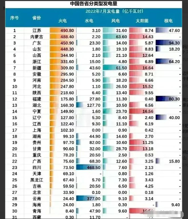 2022年7月全國各省火力發(fā)電量:江蘇省以490.8億千瓦時位居第一,寧夏接近湖北,四川僅第23。